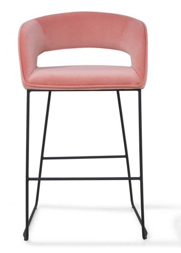 Moderní barová židle z látky s černým práškově lakovaným ocelovým podstavcovým rámem. Teflonová úprava látky v barevném provedení - mořská zelená, mátově modrá a losová.