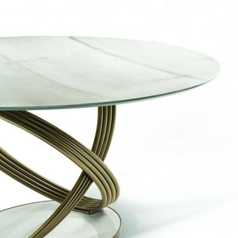Stůl pevný s otáčivým kolem. Základna v lakovaném kovu, vrchní plát v dýze, nebo keramice.