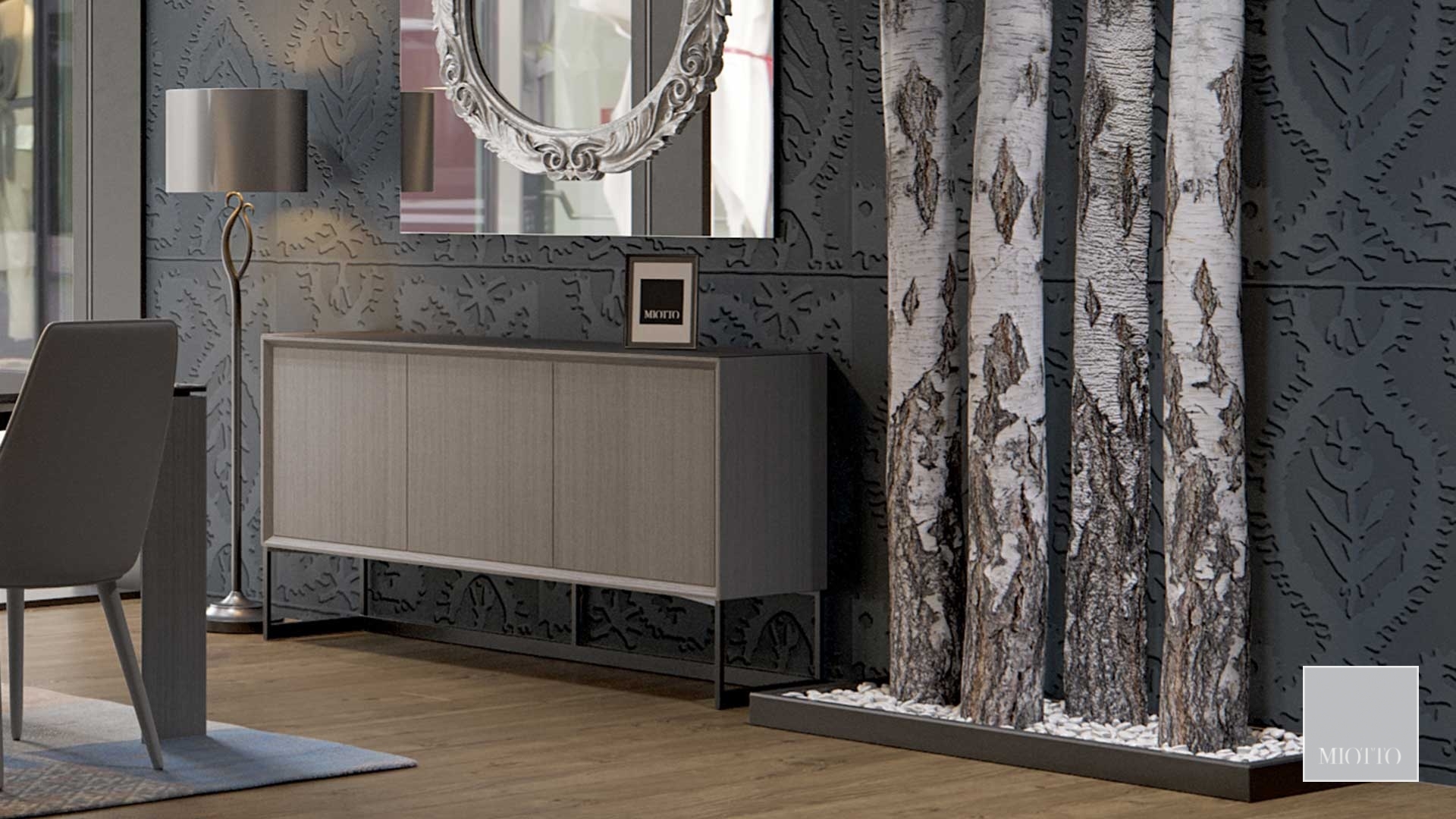 Komoda ve světle šedé dubové dýze. Horní keramická skleněná deska. Nohy s černým práškovým nástřikem. Hrany v moderním stylu.
