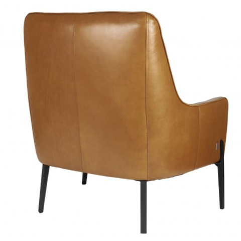 Moderní křeslo pro volný čas. Celočalouněné vysoce kvalitní kůží v anilinové úpravě, která zachovává přirozený povrch kůže. Matné práškové černé kovové nohy. Elegantní design a klasická koňaková barva, doplněná vysoce kvalitními materiály.