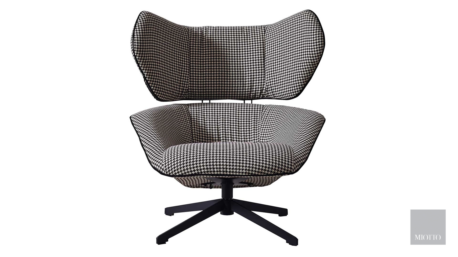 Okřídlená židle pro volný čas s vysokým opěradlem z látky s černými kovovými nohami s práškovým nástřikem. Kombinace ikonického tvaru křídla a klasické látky se vzorem pepita s černým lemováním z ní dělá jedinečnou směs módního moderního a klasického designu .