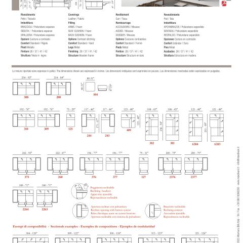 Možnost provedení v kůži i látce s kovovou podnoží. Pěnová výplň se standardním sedem s možností zvolení tvrdšího sedu bez příplatku. Výška sedací soupravy je 100 cm s opěrkou hlavy a hloubka 110 cm. Polohovací hlavové opěrky a možnost zvolení elektrického polohování.