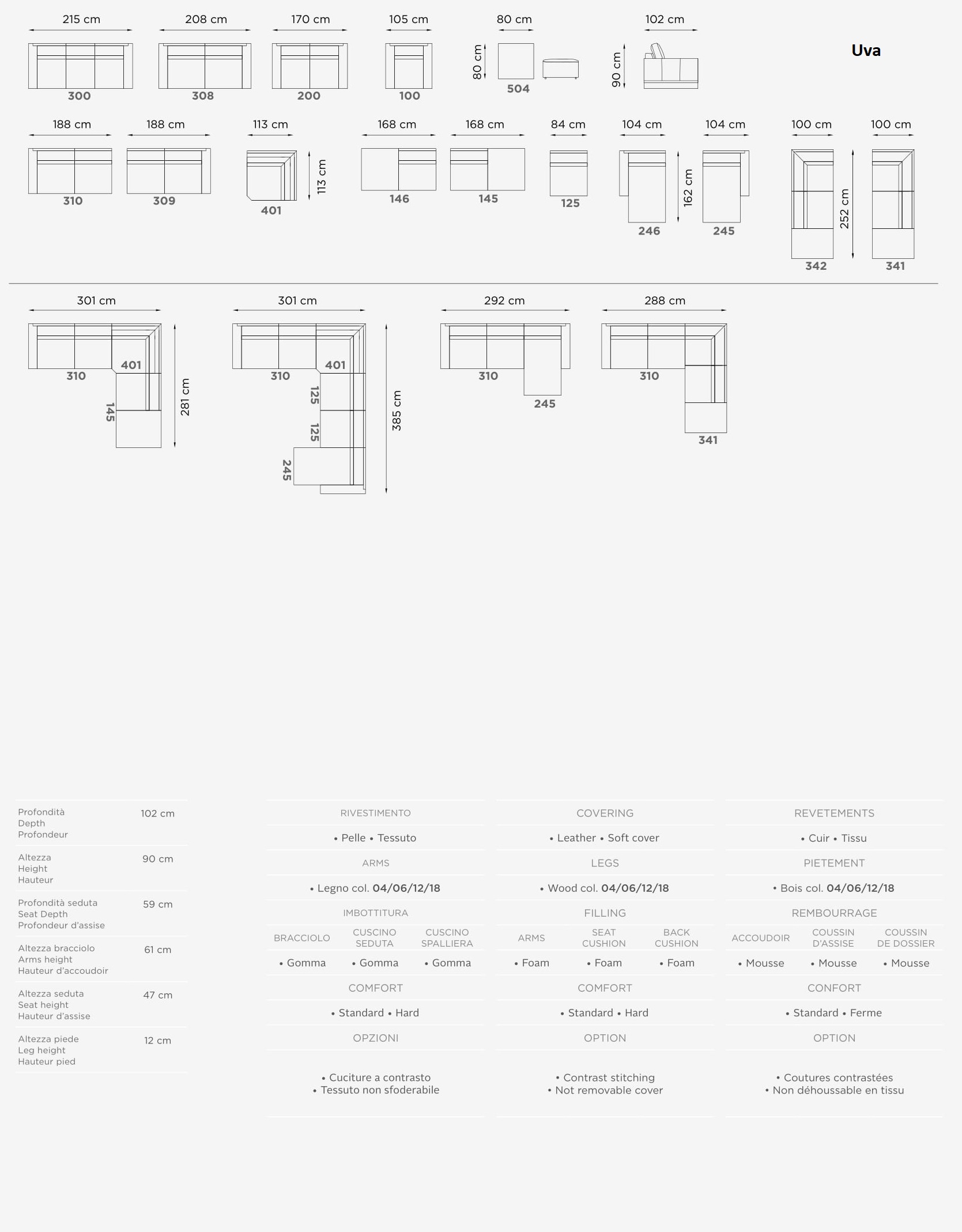 Výška sedací soupravy je 90 cm a hloubka 102 cm.